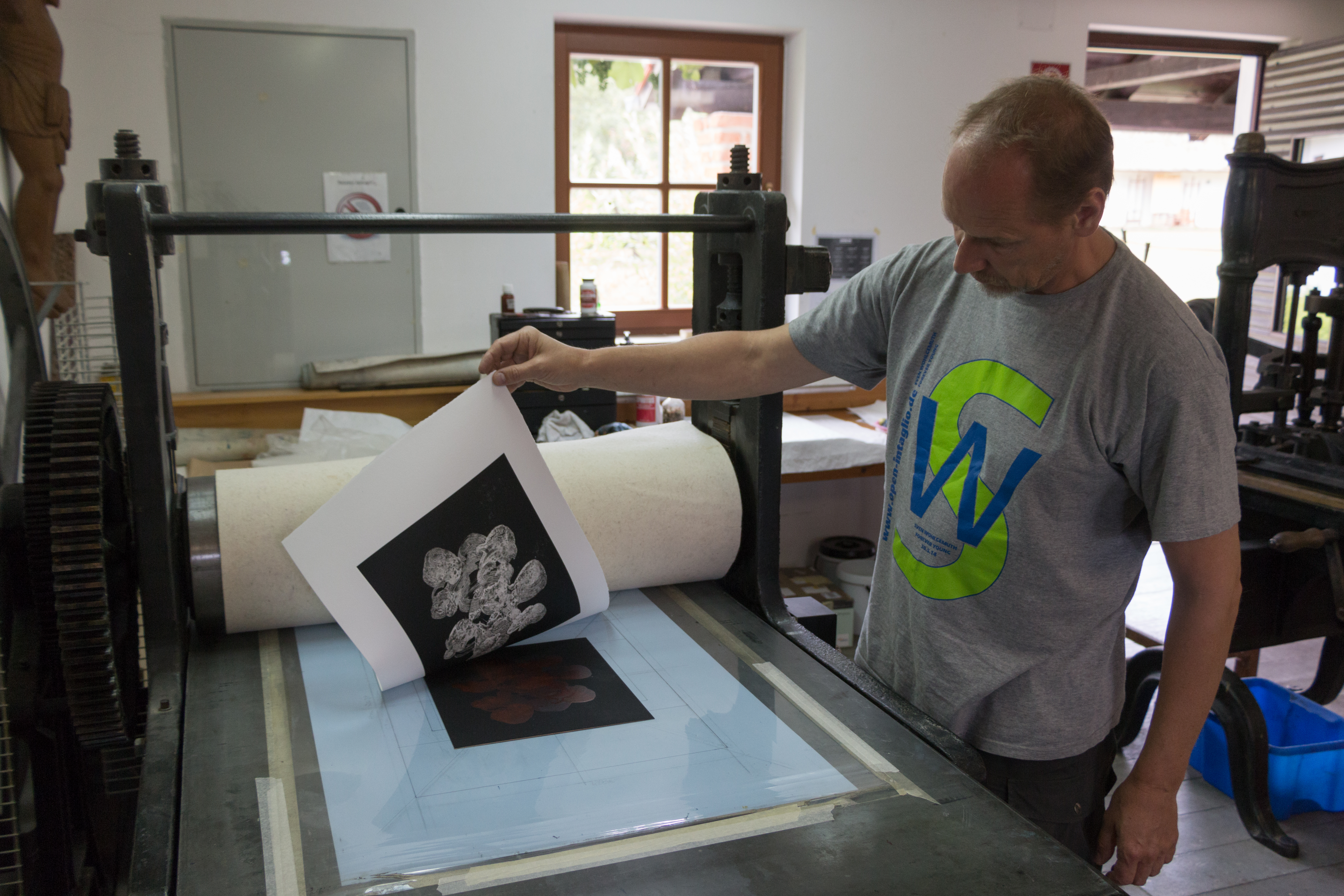 Die manuellen Drucktechniken Holzschnitt, Radierung, Lithographie